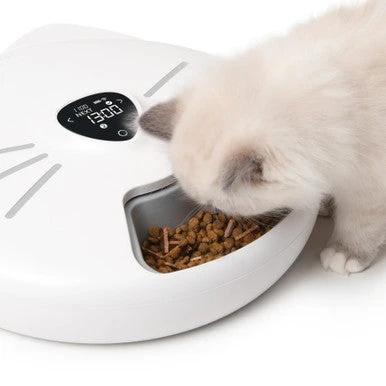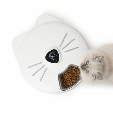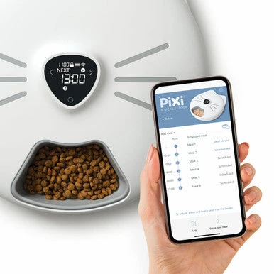 The Catit PIXI Smart 6-Meal Feeder enables you to feed your cat up to 6 varied meals per day, fully adapted to their feeding pattern. You only need to load the tray with healthy portions of your cat’s preferred selection of dry food, wet food or treats, and the feeder will serve their daily meals as scheduled in the free Catit PIXI app. The 6-meal feeder features a cat-proof design and control panel lock to ensure there will be no snitching food, and that your cat is well-fed even when you’re not at home! The feeding tray stops rotating when met with resistance, making sure your cat’s paws are safe from harm or entrapment. It’s also possible to set and adjust the feeding schedule using the display on the feeder, or to skip ahead and serve the next meal. The app and feeder settings sync in real-time. There are 6 trays, but you determine the number of meals and amount of food that goes in. Pre-portioning your cat’s meals allows you to monitor their food intake, and helps prevent binging or overeating.