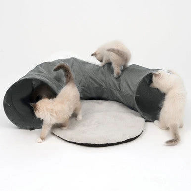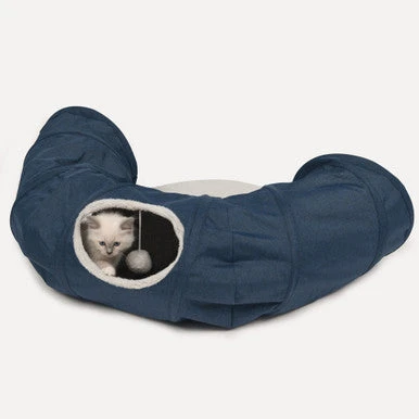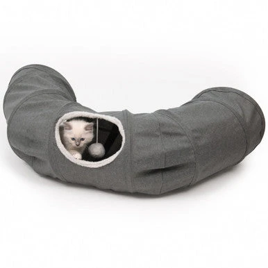 The Catit Vesper Tunnel is an exceptionally stylish, open-ended cat play tunnel. It has a little peek-a-boo opening in the middle with a plush ball toy hanging on a string. This spot is perfect for cats to observe their surroundings through. If your cat needs some downtime after play, they can unwind on the round padded cushion. Made of high-quality fabric.