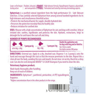 Directions: External use. Apply to a dry, brushed coat. Dispense 1 or 2 pump(s) onto the hand and massage through the coat so that the mousse penetrates to the skin. Repeat this action all over the body, avoiding the eyes and mouth. Do not rinse. Let air dry. Brush for a shiny coat. Can also be used alongside DOUXO S3 CALM Shampoo if you need to clean the skin.