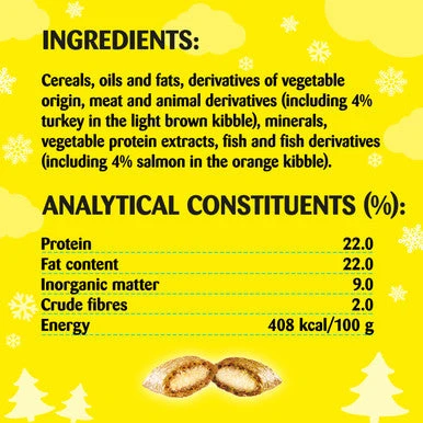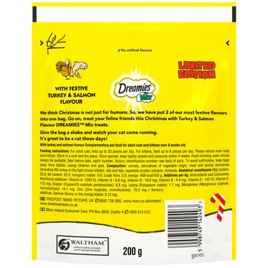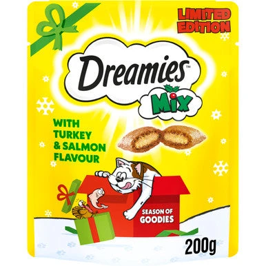 Dreamiesâ„¢ treats are deliciously crunchy on the outside, and soft on the inside. We think Christmas is not just for humans. So, we have put 2 of our most festive flavours into one bag. Go on, treat your feline friends this Christmas with Turkey & Salmon Flavour Dreamiesâ„¢ Mix cat treats for Christmas.