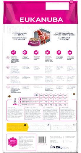 Eukanuba Adult Dry Dog Food Premium Performance Working & Endurance is the right dog food for working dogs that spend a lot of time outside and need to be alert and energetic over a longer period of time. Hunting, patrol or rescue dogs reach a sustained energy peak performance with our highest levels* of protein (30%) and fat (20%). This enables them to build strong, lean muscles and keeps them ready to take on any challenge they encounter during their work with you. The energy levels achieved by feeding this healthy nutrition also support pregnant and lactating females to stay strong and take best care of their puppies. Nutrients like omega-3 fatty acids for good nose and scenting ability make sure your dog finds his way to securely accomplish his tasks. Formulated with prebiotics and clinically proven beet pulp, this high quality food promotes digestive health and optimises the absorption of all important nutrients. Calcium for strong bones and clinically proven antioxidant for strong natural defences keep your dog active and athletic so he can always focus on giving his best. Since you want your best friend to be great on the inside and look extraordinary on the outside, this adult dog food contains an optimal ratio of omega-6 and -3 fatty acids to promote a healthy skin and radiant coat while they also help to reduce shedding by up to 80%**. Eukanuba Adult Dry Dog Food Premium Performance Working & Endurance uses 3D DentaDefense technology, which cleans your dog’s teeth with every bite, reduces tartar build-up by up to 80%*** and helps your dog maintain strong teeth. This working dog food was developed with veterinarians and is recommended by top breeders. It is 100% complete and balanced to help your best friend perform as extraordinarily as possible together with you – at any time and in any situation. *For adult dogs.