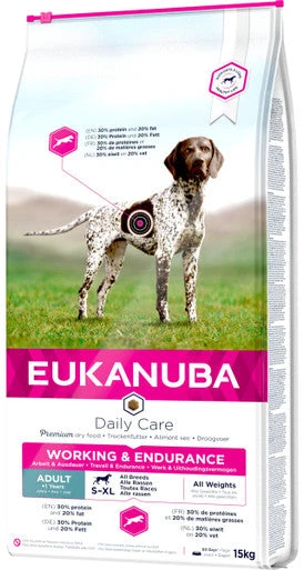 Eukanuba Adult Dry Dog Food Premium Performance Working & Endurance is the right dog food for working dogs that spend a lot of time outside and need to be alert and energetic over a longer period of time.