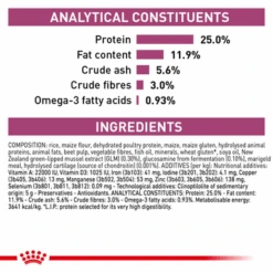 Chicken 74% (chicken ground and cooked, de-boned chicken, chicken fat, natural chicken flavour), whole brown rice, white rice, oatmeal, potatoes, salmon ground and cooked, dried chicory root, apples, carrots, cranberries, flaxseed, alfalfa, potassium chloride, salmon oil, whole dried chicken egg, phosphoric acid, dried rosemary, calcium carbonate, yucca schidigera extract.