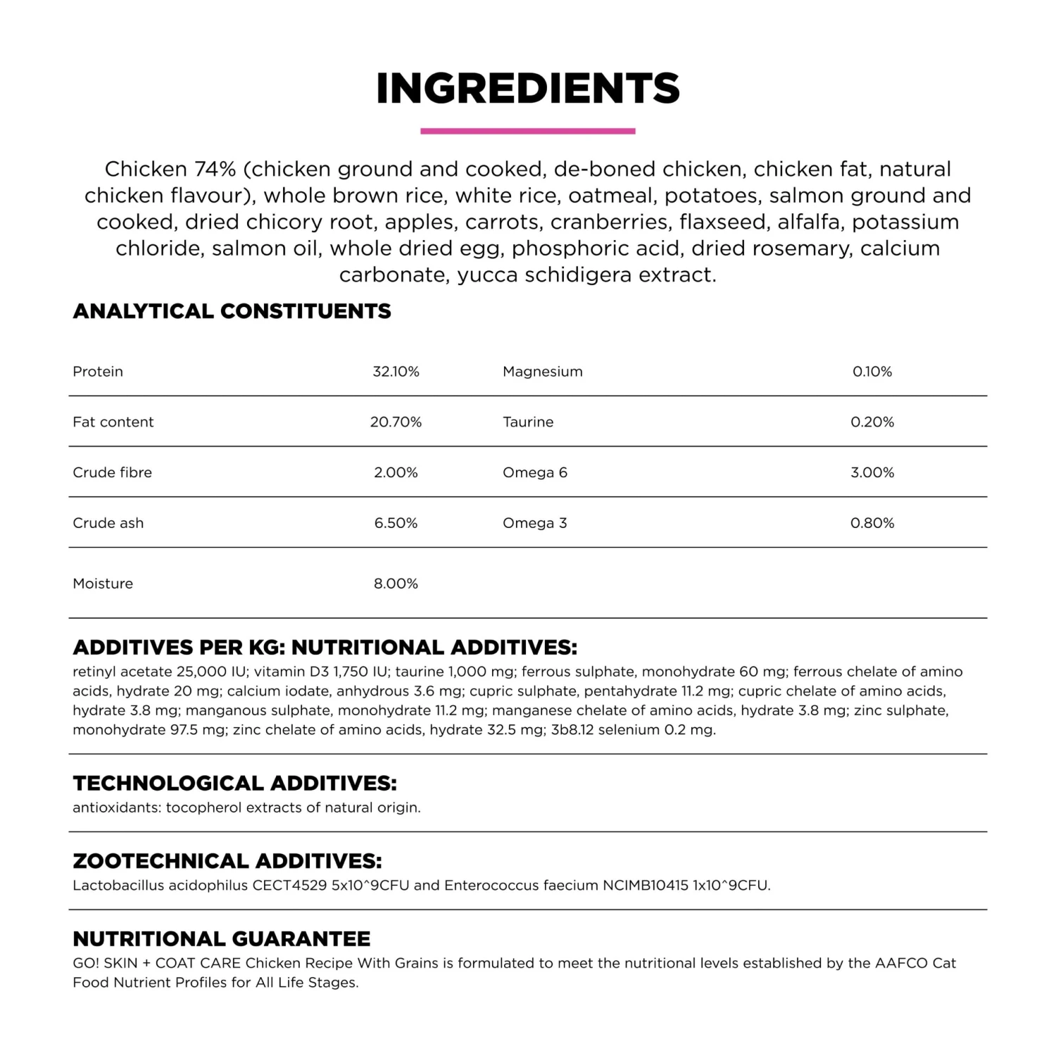 Dry skin and dull coats can start from compromised and damaged skin barriers. That’s why our Skin + Coat Care Chicken dry cat food recipe with grains was formulated by our expert pet nutritionists with omega fatty acids to help keep your cat’s skin hydrated and their coat healthy. Made with premium quality ingredients, like de-boned chicken, antioxidant-rich fruits and veggies, and energizing whole grains, this recipe offers complete and balanced nutrition that takes a proactive approach to your cat’s skin and coat health.