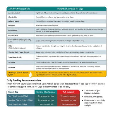 Joint Aid for Dogs is a high specification supplement & Manufactured as very palatable 2mm pellets for quick, easy feeding. It provides a combination of 22 active nutraceuticals to maintain healthy joints, aid freedom of movement and support the natural regeneration of muscle regardless of age, size or level of exercise.