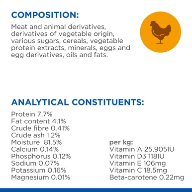Hill’s Science Plan Adult chicken, beef and ocean fish cat food tender chunks in gravy. It has the perfect balance of taste and nutrition and is specially formulated to fuel the energy needs of cats during the prime of their life. Made with high quality, easy-to-digest ingredients. Essential taurine for heart health & balanced minerals to support kidneys & bladder. High-quality protein for lean muscles. Vitamin E, Omega-3s & -6s for beautiful skin & fur