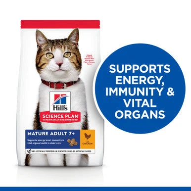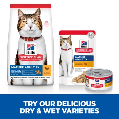 The right food can help. Hill’s SCIENCE PLAN Mature Adult Cat Foods provide a synergistic ingredient blend to help support energy and activity levels and promote graceful ageing. This delicious food contains essential taurine for heart health and balanced minerals to support kidneys and bladder. With fibres for healthy digestion and Vitamin E and Omega-3s & 6s for beautiful skin and fur.