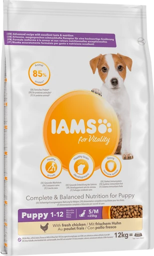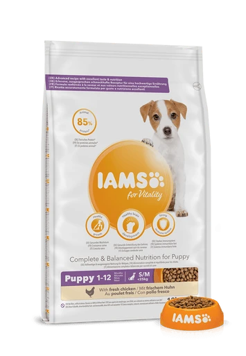 Iams ProActive Health Puppy & Junior Small and Medium Breed is recommend for small and medium breed puppies (adult weight 2.5 – 25kg) from 1-12 months old. With a tailored fibre blend including Prebiotics and beet pulp for healthy digestion.