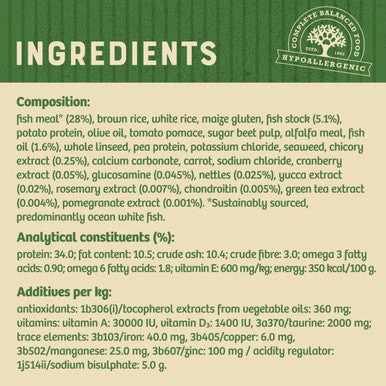 Expertly tailored to the needs of overweight cats, we’ve taken a handful of nature’s nourishing ingredients and combined them with sustainably sourced, predominantly ocean white fish. Then, using our knowledge and expertise, we increase the level of dietary fibre to satisfy the cat’s appetite and increase the protein to encourage loss of body fat rather than muscle. This recipe has been carefully formulated for cats, supplemented with taurine to support heart health and a blend of omega oils, glucosamine, chondroitin and plant extract to support joints.