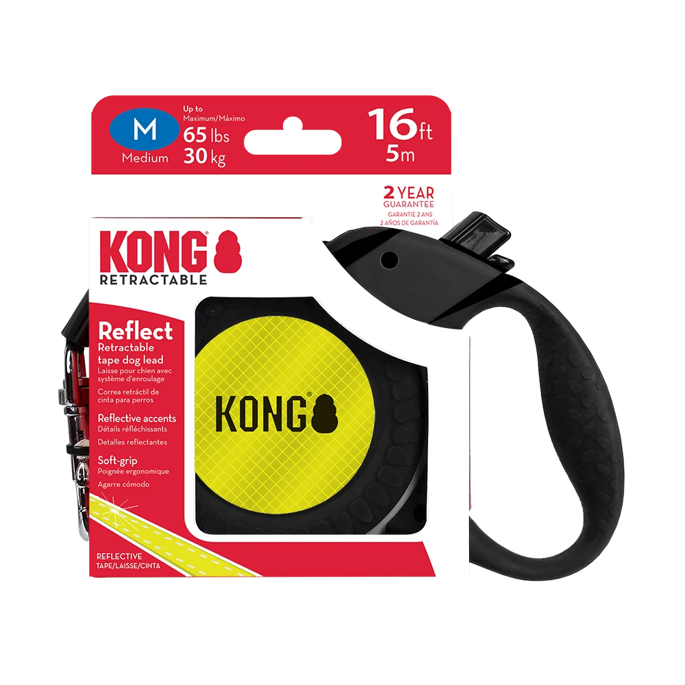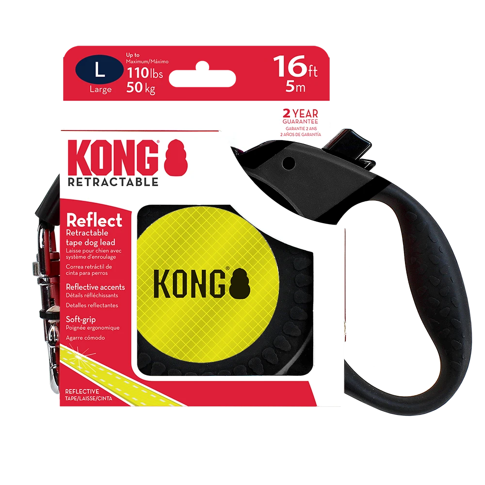 KONG Retractable Leash Reflect Large Black The new KONG retractable lead series includes unique models designed for different types of dogs and walking environments. Each model features a soft grip handle with added grip support for a comfortable hold and wide tape webbing. Our intuitive brake and lock mechanism works with a natural walking motion and with a dog’s walking tendencies.