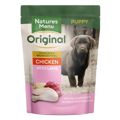 A complete and balanced 68% real meat meal for puppies. Prepared with quality whole cuts of raw chicken, lamb and wholegrain rice.Suitable from weaning age.Our pouches are filled with quality raw ingredients, then gently cooked to ensure all the Natures Menu goodness is locked in. A great alternative to raw feeding when travelling or staying away. We only use quality, human grade meats in our pouches, and absolutely no meat meals or meat derivatives. All of our complete and balanced meals are veterinary approved and made to Fediaf guidelines.