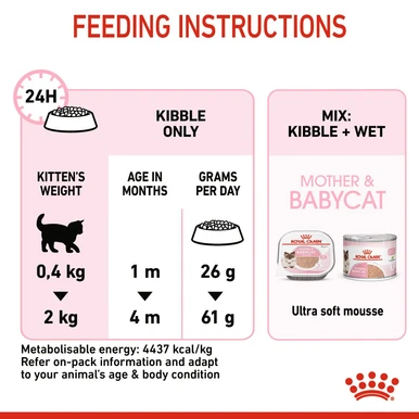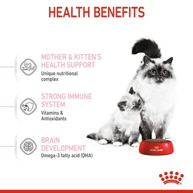 Royal Canin® Mother & Babycat is specially adapted to meet your cat’s high energy needs at the end of gestation and during lactation. It’s also formulated to support the healthy development of nursing kittens up to 4 months old.