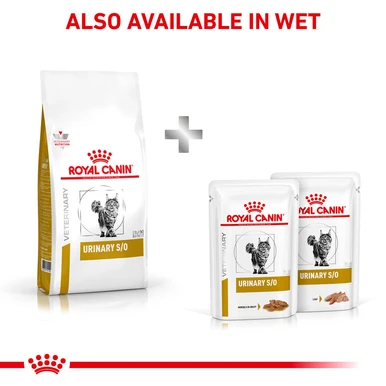 When your cat has urinary health concerns, a tailored and nutritionally balanced diet can help to ease any discomfort and support good urinary tract and bladder health. Royal Canin® Feline Urinary S/O food is specifically formulated with the needs of your adult cat in mind and is available in 1. 5kg, 2. 5kg and 7kg bags. Royal Canin® Feline Urinary S/O helps to dissolve all types of struvite stones in your cat’s bladder. What’s more, this product also helps with the dilution of your cat’s urine, making it less likely that struvite and calcium oxalate stones will form in the first place. Royal Canin® Feline Urinary S/O’s Relative Super Saturation (RSS) methodology helps to lower the concentration of ions that contribute to crystal formation. Because one of the natural components of struvite crystals is magnesium, Royal Canin® Feline Urinary S/O is exclusively formulated with a reduced level of magnesium to further support your cat’s overall urinary health. If your cat is overweight or prone to weight gain, consider offering them Royal Canin® Feline Urinary S/O Moderate Calorie that contains all of the benefits of their counterpart, just with fewer calories. As part of the Royal Canin® Veterinary Health Nutrition range, it is important that this product is only given to your pet when recommended by a veterinary professional. To cater to each cat’s individual preferences, Royal Canin® Feline Urinary S/O is also available as wet food in either a delicious gravy or a soft and tasty loaf. If you’re considering mixed feeding, simply follow our feeding guidelines to ensure your cat gets an accurate amount of both wet and dry food for optimal benefit. At Royal Canin® we’re committed to providing nutritional solutions to your pet’s needs. All of our products undergo an extensive quality control process in order to guarantee the optimum quality of food, as well as catering to your cat’s specific dietary requirements and lifestyle. This means that when your cat eats Royal Canin® Feline Urinary S/O, it’s getting a complete and balanced diet.