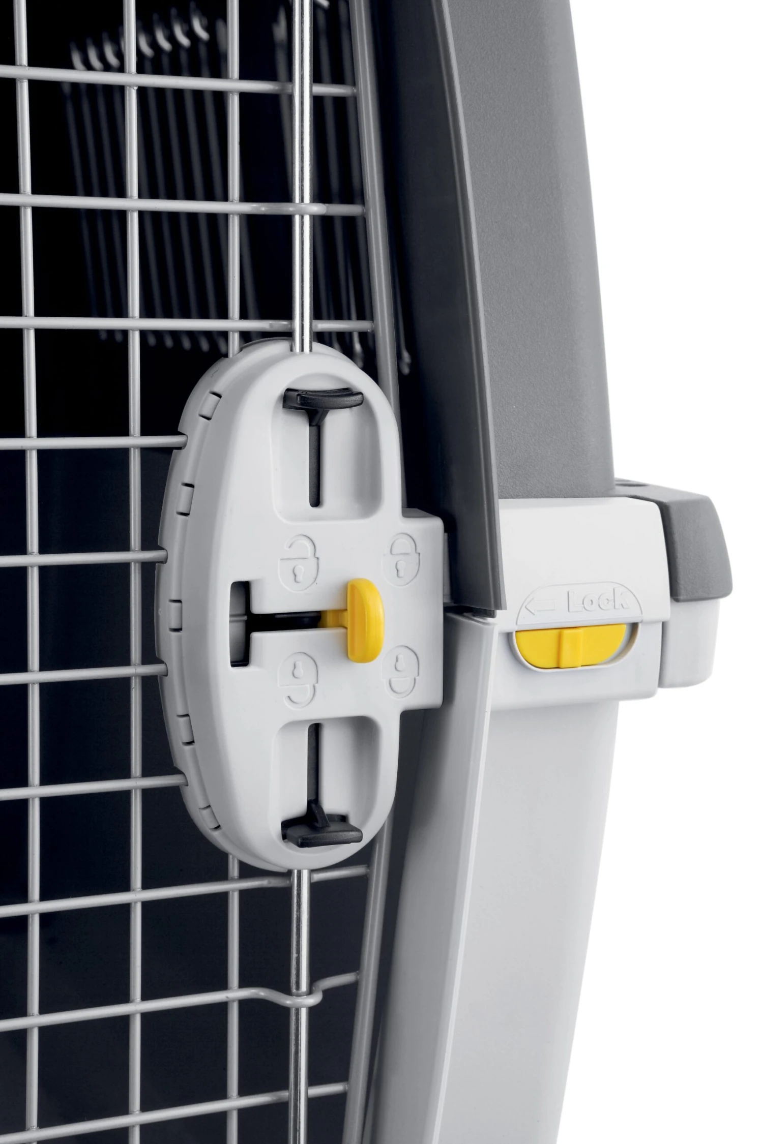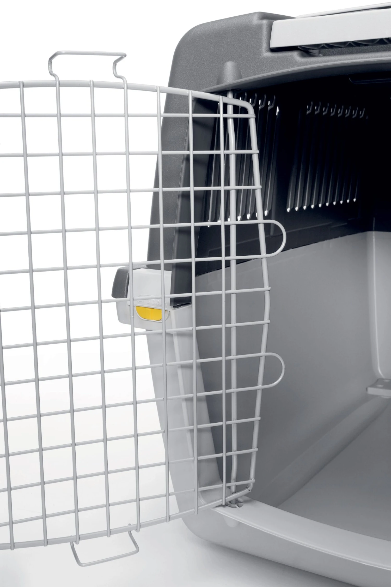 Practical carrier provided with anti-pressure relief stripes on the metal front grid, side fastening door with latch, and fastener kit for safety to allow a safe transportation for your pet. Produced according to IATA regulation. The 4 wheels set completes the product (optional).