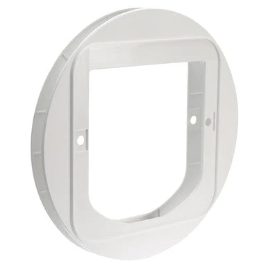 When installing the SureFlap Microchip Cat Flap or the DualScan Microchip Cat Flap into glass, walls and certain door types a mounting adaptor is required. A circular hole with a diameter of 212mm (min) to 260mm (max) is required for installation in glass, with the ideal size being 212mm. The total diameter of the mounting adaptor is 285mm. In wall installations a mounting adaptor allows you to remove the cat flap more easily without damaging the wall.